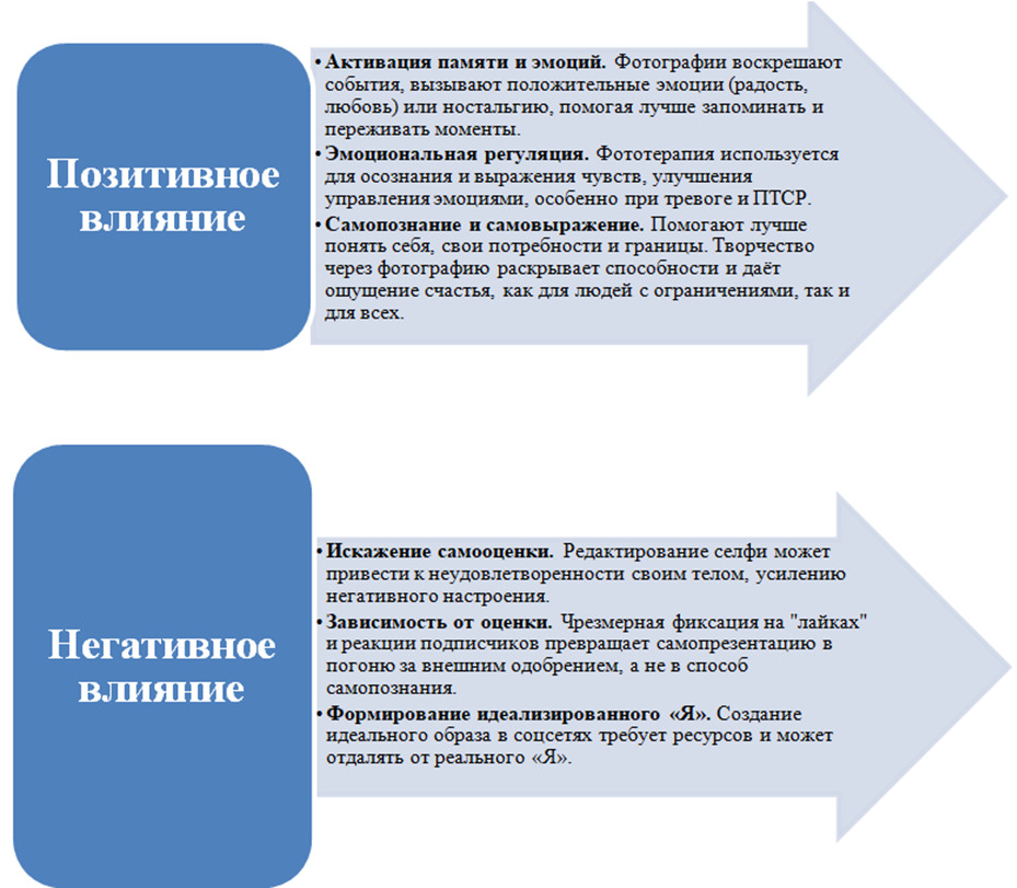 Важным фактором стало и действие механизма социального вознаграждения: лайки, комментарии и подписки активируют систему дофаминового поощрения, формируя зависимость от фотоконтента и стремление постоянно обновлять свою визуальную ленту [2, с. 61-66]. Селфи-культура усилила ориентацию на самопрезентацию, заставляя пользователей конструировать визуальный образ, соответствующий социальным ожиданиям, что порождает давление перфекционизма и страх оценки (табл.).