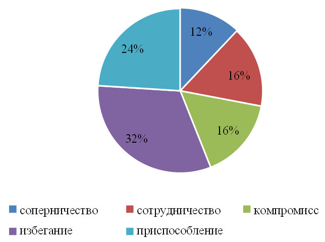 В рамках нашей работы было проведено исследование по методике «Тест Томаса-Килманна «Поведение личности в конфликтной ситуации» для определения стратегий поведения в конфликтах среди педагогов общеобразовательной школы. В результате применения методики изучения стилей конфликтного поведения К. Томаса были получены следующие результаты: стратегию соперничества в конфликтах выбирают 12% педагогов, сотрудничества – 16%, компромисса – 16%, избегания – 32%, приспособление – 24% (рис.).