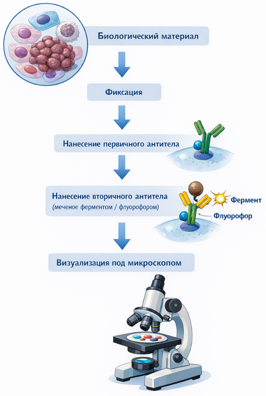 Стандартный процесс ИЦХ включает фиксацию образца, последующее связывание с антителами, мечеными ферментами или флуорофорами, и визуализацию под микроскопом. Метод опирается на принцип антиген‑антитело и может выполняться с использованием прямого или непрямого способа окрашивания: