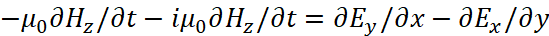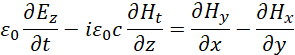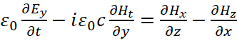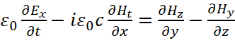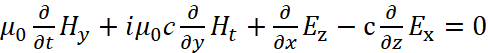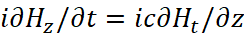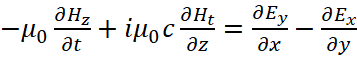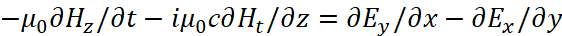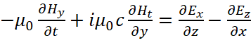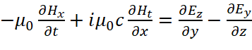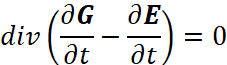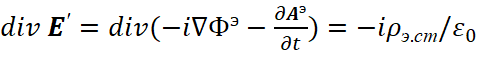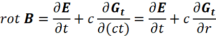 Понятно, что мы должны показать, как внесение мнимой единицы в уравнения Максвелла повлияло на переход к волновому виду уравнений. С этой целью мы должны учесть, что дивергенция (градиент) от напряжённости электрического или магнитного поля, в среде распространения, связана с изменением оставшейся компоненты проекции на время, как это видно из (93). В этом случае система уравнений (69) представляется в виде: