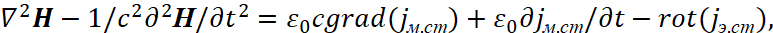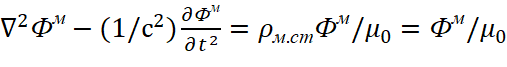 Иными словами, слева от знака равенства одна система наблюдения, которая равняется нулю, а справа от знака равенства противоположная система наблюдения с отсутствием обнуления. Как было показано нами в [31, с. 5-37], в этом случае с учётом калибровки Лоренца (72), мы имеем волновое уравнение в зависимости от тока смещения в виде: