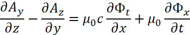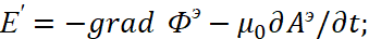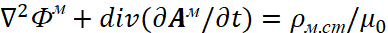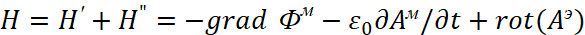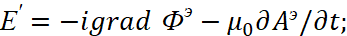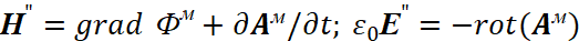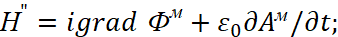 . Существует также и комплексно-сопряжённая форма записи этих уравнений. Так как, полученные уравнения фактически отражают общую формулу мироздания (1), а это необходимое условие существования объекта в нашем мироздании (иначе он ноль), то величинами, определяющими параметры объекта, являются константы электрической и магнитной проницаемости. Так как у нас векторные потенциалы имеют аналогичные законы физики совпадающими с электромагнитными составляющими, но в противоположности, то отсюда имеем вид в частных производных для векторных потенциалов в виде: