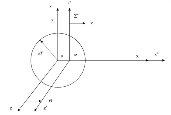 Рассмотрим электромагнитную волну, порождаемую точечным источником света в момент времени t=0, и выясним, как будет выглядеть её распространение в двух инерциальных системах отсчёта, движущихся друг относительно друга со скоростью v. Пусть, скажем, система Σ связана с неподвижным эфиром, а система Σ* движется вдоль оси Х со скоростью v, так что в момент t=0, их начала отсчёта совпадают с положением источника.