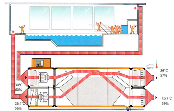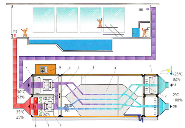 В переходный период года рекуперативный теплообменник компенсирует затраты на нагрев наружного воздуха до необходимой температуры для подачи в помещение с зеркалом воды.