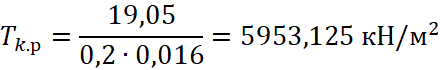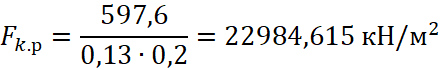 На балку нагрузка с колеса передаётся через рельс. Ширина рельса составляет 0,13 м, а длину участка примем 0,2 м, толщина полки составляет 0,016 м. Тогда нагрузка от колеса и тормозная нагрузка составят:
