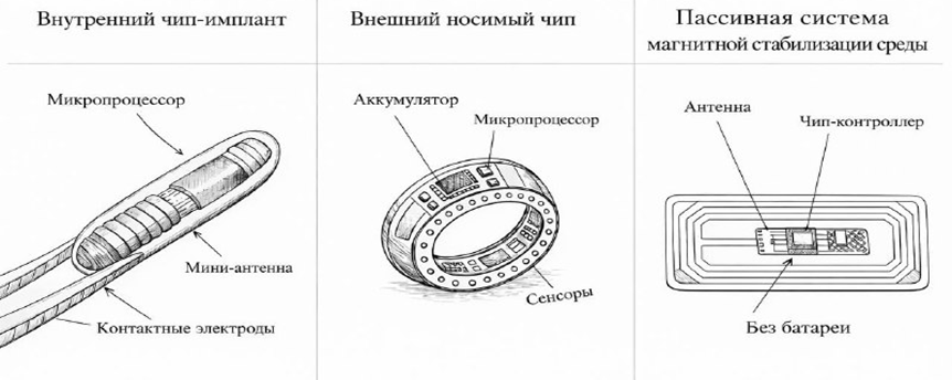 Внутренний чип представляет собой имплантируемое электронное устройство, предназначенное для регистрации изменений геомагнитного поля и генерации локального компенсирующего поля [6]: