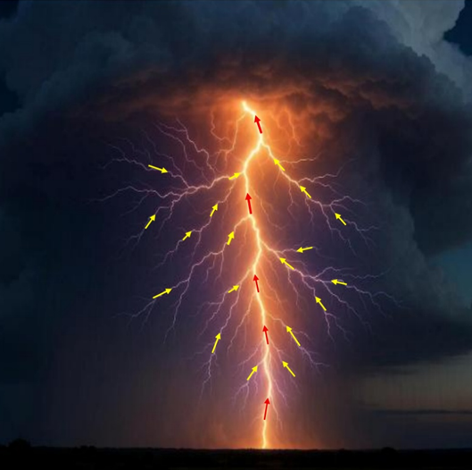 Таким образом, образовавшаяся молния между облаком и землёй похожа на «дерево» (рис. 1–3) с тем лишь отличием, что все внутриоблачные заряды стекаются по ветвям к стволу «дерева» (основному каналу разряда молнии), увеличивая его (её) диаметр и мощность разряда.