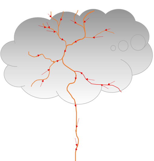 Их форма, как отмечают исследователи, соответствует модели убегающих электронов. Такая напряжённость электрического поля (более 1016 В/м) порождает все условия для образования сильно разветвлённого «проводящего дерева». Авторами работы [19] установлено, что «внутриоблачные разряды почти всегда возникают либо сами по себе, либо в начале вспышки молнии, это убедительно свидетельствует о том, что они являются инициирующими формированиями для образования грозовых электрических разрядов». В результате моделирования развития внутриоблачных молний [20, с. 50-71] получена гипотеза, что импульс тока внутриоблачной молнии протекает как чисто стримерный пробой (гигантская лавина стримеров), развивающийся без формирования лидерного канала.