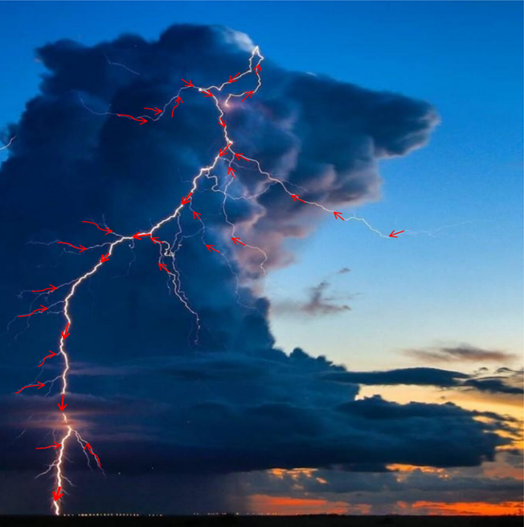 Каждый лидер при образовании новой ступени своего развития образует импульс высокой напряжённости 1016 В/м, преимущественно распространяющийся в направлении электрического поля грозового облака, так и во всех остальных направлениях. В результате происходит ионизация окружающего пространства, образование новой ступени развития лидера и разрастание «ветвей проводящего дерева». Ранее в работе [21, с. 9‐15] было показано, что каждая часть молнии является поджигающим разрядом для формирования следующей «черной молнии» при чем, чем мощнее поджигающий разряд, тем мощнее «темная молния», тем ниже пробивные градиенты для развития длинной молнии. В образовавшийся основной канал молнии происходит вливание боковых каналов молнии, которые и образуют видимую древовидную структуру образовавшейся молнии. Наиболее мощные «темные молнии» создают более мощные гамма и рентгеновское излучения, основная мощность которых направлена вдоль молнии.