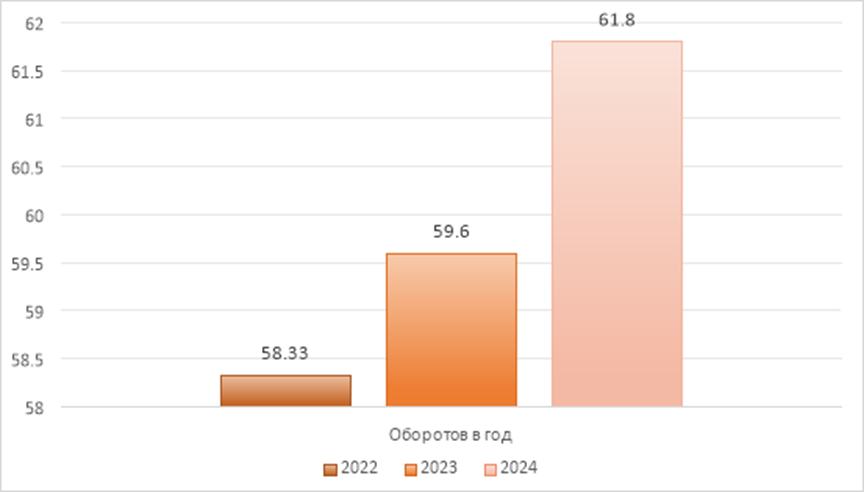 Данные таблицы 3 свидетельствуют о положительной динамике оборачиваемости денежных средств. Коэффициент оборачиваемости устойчиво растёт, достигнув в 2024 году 61,8 оборота в год, что на 5,9% выше показателя 2022 года. Соответственно, период оборота сократился с 6,17 до 5,82 дня.
