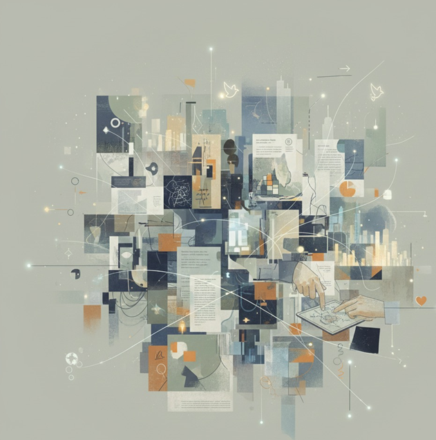 Рис. Символическое пространство, отражающее современные социально значимые художественные практики в контексте некоммерческих и гуманитарных инициатив. Иллюстрация выполнена в абстрактно-концептуальной форме и отражает социально значимые художественные практики как связующий элемент между некоммерческими инициативами и общественным пространством. В композиции отсутствует прямое изображение выставочного зала; вместо этого использованы символические фрагменты, соединённые световыми и графическими линиями, визуализирующими процессы культурной медиации и социальной ответственности. Многослойная структура изображения подчеркивает междисциплинарный характер современных гуманитарных художественных практик и их роль в формировании устойчивых социальных связей. Иллюстрация акцентирует внимание не на событии, а на процессе взаимодействия искусства, общества и некоммерческого сектора