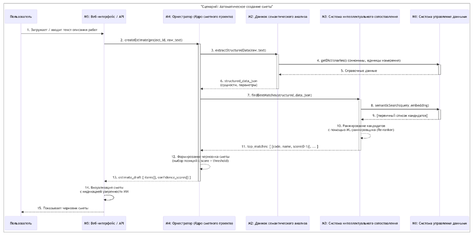 Оркестратор и бизнес-логика. Этот модуль управляет всем workflow: принимает сырой текст, вызывает последовательно Модуль 2 и Модуль 3, получает список расценок, рассчитывает объемы и стоимости на основе извлеченных параметров, и формирует итоговый сметный документ в требуемых форматах (XLSX, XML). Он же обеспечивает целостность данных и работу с черновиками.