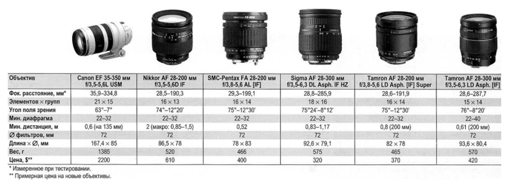 Рис. 3. Сравнительная таблица оптических характеристик объективов