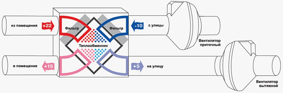 Рис. 1. Схема приточно-вытяжной вентиляции с рекуператором