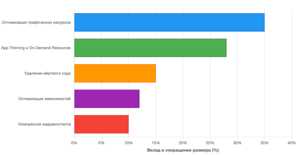 График (рис.) демонстрирует вклад различных методов оптимизации в общее сокращение размера приложения на примере iOS-проекта e-commerce: