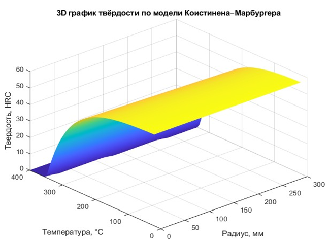 Для валов диаметром 200–600 мм моделируется распределение температуры по радиусу при охлаждении. Внешние зоны остывают быстрее, что повышает долю мартенсита и увеличивает твёрдость. В центральной части температура снижается медленно, что приводит к частичному мартенситному превращению или даже его отсутствию, что уменьшает твердость. Применение модели Коистинена–Марбургера позволило получить количественные значения: в поверхностной зоне твердость достигает 52–56 HRC, в переходной – 42–48 HRC, а в центральной – менее 30 HRC. Это соответствует известным тенденциям и подтверждает применимость модели для массивных деталей.