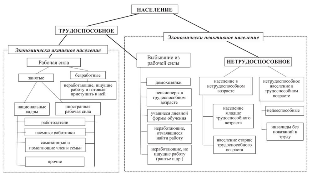 В общей массе населения, вне зависимости от возраста и физических возможностей, выделяют людей, сохраняющих способность к трудовой деятельности. Следует отметить, что способность к труду не всегда напрямую связана с возрастными рамками. В зависимости от наличия или отсутствия этой способности, выделяют: лиц, находящихся в трудоспособном возрасте, за исключением инвалидов I и II групп, и граждан, пользующихся льготами; работающих подростков, еще не достигших 16-летнего возраста; а также работающих пенсионеров [1, с. 63].