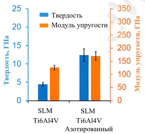 Газовое азотирование повышает твердость поверхностного слоя SLM Ti-6Al-4V в 2,7–3,1 раза. При глубине внедрения 200 нм твердость увеличивается с 4,3–4,7 ГПа до 11,6–14,6 ГПа.