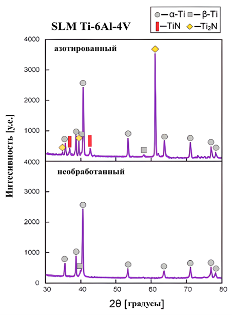 Рис. 1. Дифрактограмма необработанного и азотированного SLM Ti-6Al-4V
