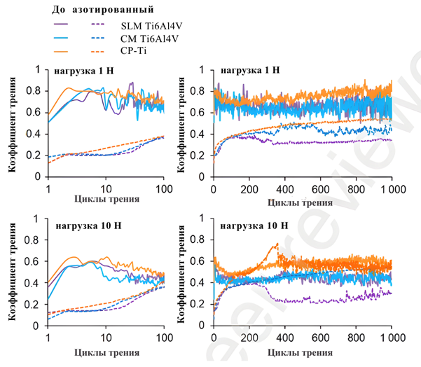 Рис. 2. Тенденции трения SLM Ti-6Al-4V сплава до и после азотирования при нагрузке 1Н (сверху) и 10Н (снизу)