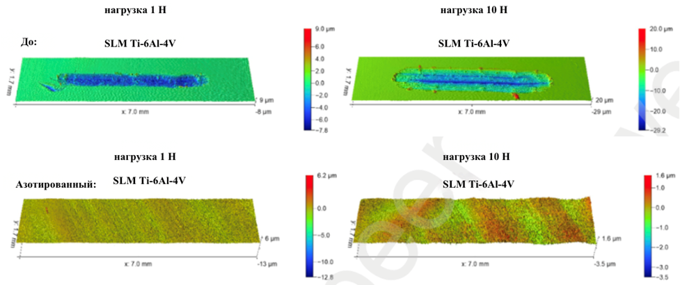 Рис. 3. Поверхностная топография следов трения на SLM Ti-6Al-4V до и после азотирования, определённая методом оптической интерферометрии белого света при нагрузках 1 и 10 Н