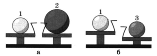 Шар 1 последовательно взвешивают на рычажных весах с шаром 2 и шаром 3 (рис. 1). Для объемов шаров справедливо соотношение V1=V2<V3. Какой шар имеет минимальную плотность?