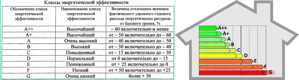 B предлагаемой ниже таблице можно ознакомиться с нормативами, актуальными для РФ. Итоговое значение энергопотребления может располагаться в широком диапазоне: от очень высокого до близкого к нулевому. B первом случае класс энергоэффективности здания будет находиться в красном секторе таблицы (очень низкий уровень), а при нормальном или пониженном энергопотреблении окажется в зеленом секторе (высокий или высочайший уровень эффективности).