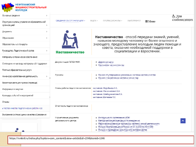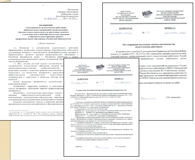 В Нефтекамском машиностроительном колледже ежегодно составляются планы и программы наставничества, действуют следующие модели: студент-студент, педагог-студент, педагог-педагог. Более подробно остановимся на модели педагог-педагог.