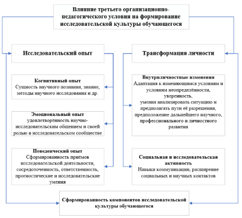 Исходя из сформулированного в ранних исследованиях авторов авторского понимания исследовательской культуры, как интегративного личностного образования, реализуемого в исследовательской деятельности, проявляющегося в исследовательском поведении и направленном на творческую самореализацию личности, её компонентного состава, включающего аксиологический, гносеологический, праксеологический и рефлексивный компоненты, отметим, что направленность организационно-педагогических условий формирования исследовательской культуры обучающихся будет продуктивной, если произойдёт их/условий влияние на указанные компоненты.