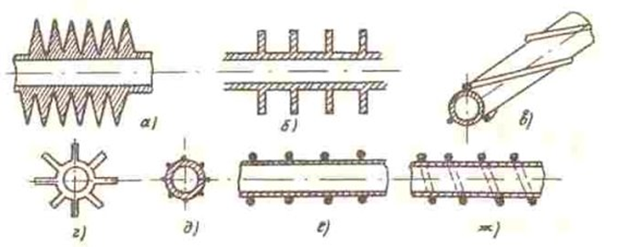 Fig. 2. Design of heat exchange tubes with a developed heat exchange surface [1, p. 47-52]: a – transverse helical fins; b – transverse annular fins; c – spiral fins; d – longitudinal fins; e – fins made of longitudinally welded wires; f, g – wire fins: annular or spiral