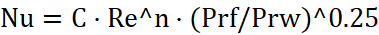 Thus, the outer tube diameter DH is taken as the defining dimension, the average velocity in the narrow cross-section of the bundle as the design flow velocity, the average flow temperature as the defining temperature, and the Prandtl number Prw is determined by the average wall temperature. For gases, Prf/Prw = 1.