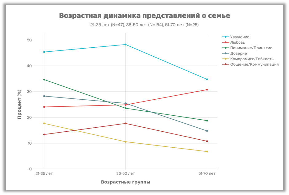 С возрастом происходит упрощение и концентрация представлений о семье. Старшее поколение (51–70 лет) значительно чаще упоминает любовь как основу (28,0%), но реже – инструментальные категории (компромисс, поддержка). Это может отражать как романтизацию прошлого опыта, так и историко-культурные различия: для старших поколений любовь была более самодостаточной основой брака, не требующей столь развитых коммуникативных навыков.