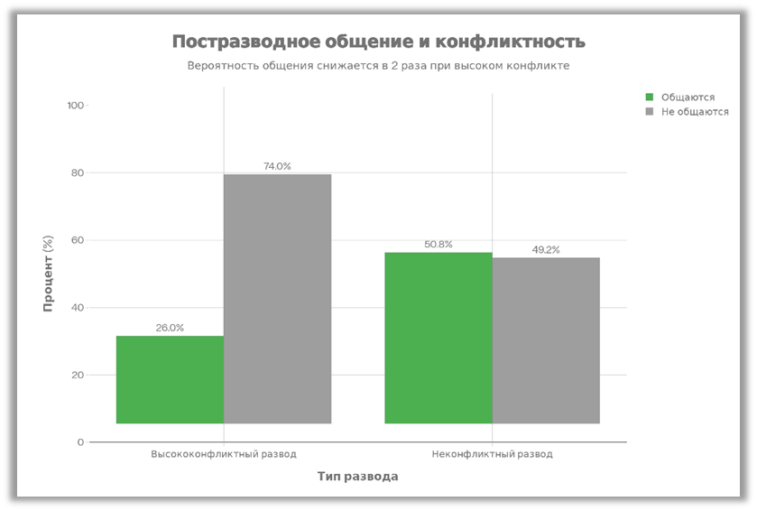 Конфликтность развода → Постразводное общение | p < 0.01 | V = 0.26 (средний) | Высококонфликтный развод снижает вероятность общения в 2 раза |