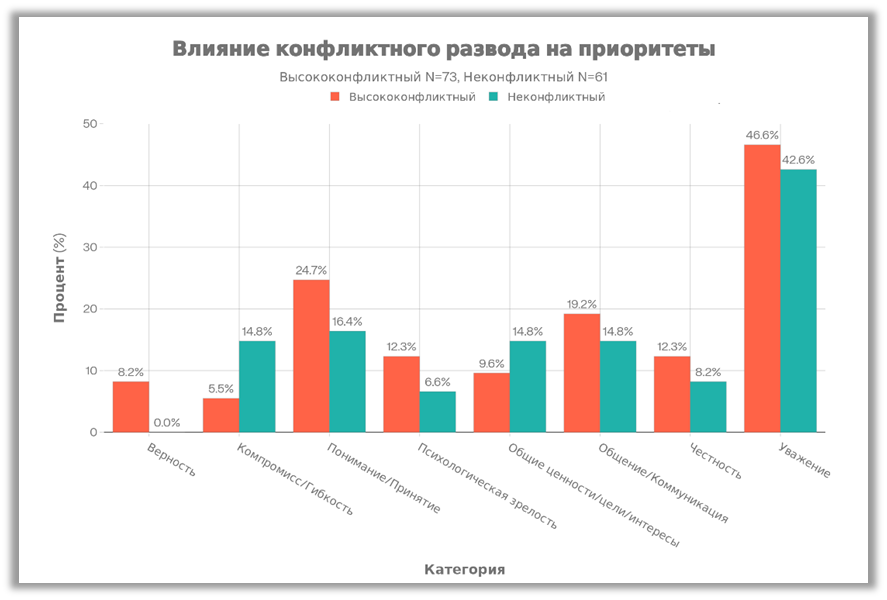 - Ретроспективные искажения: респонденты с конфликтными разводами могут ретроспективно переоценивать значимость тех факторов, дефицит которых они осознали постфактум.