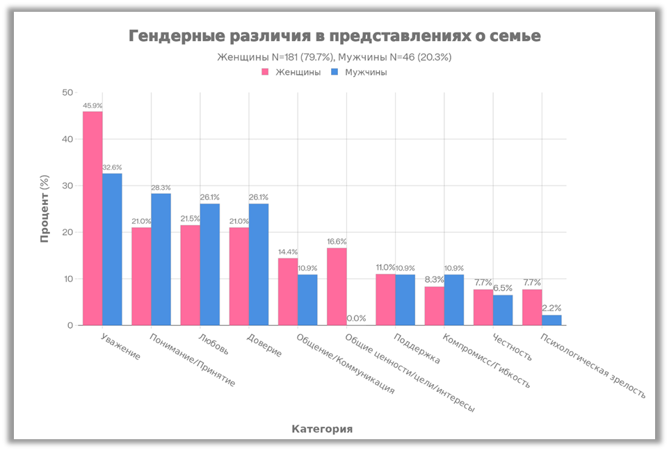 Однако полное отсутствие упоминаний общих ценностей у мужчин (0,0%) вызывает тревогу: это может указывать на дефицит рефлексии мужчин относительно ценностных оснований брака, что повышает риск конфликтов при столкновении с ценностными различиями в реальных отношениях.