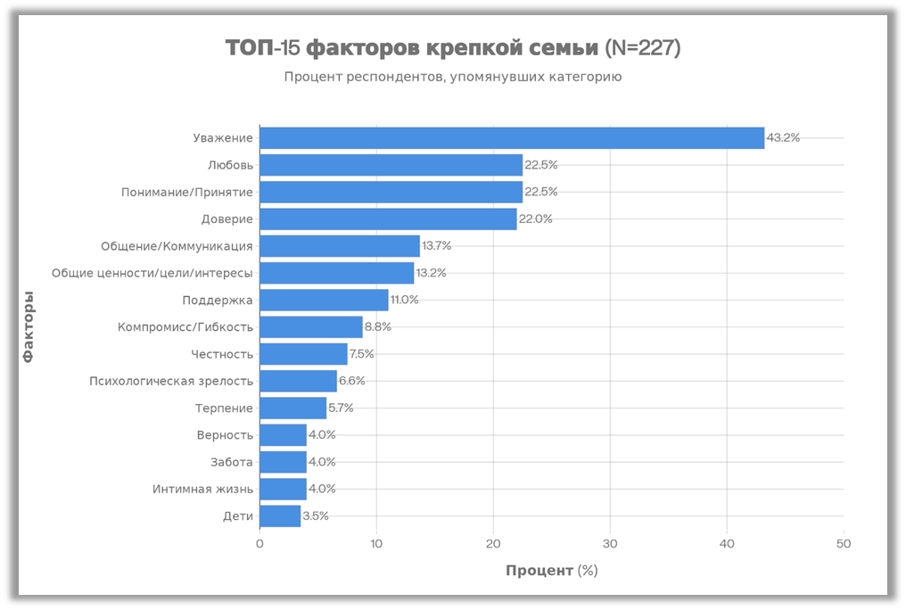 Люди понимают семью не как моноценность («только любовь»), а как систему взаимосвязанных факторов, где уважение играет роль фундамента, на котором держится всё остальное.