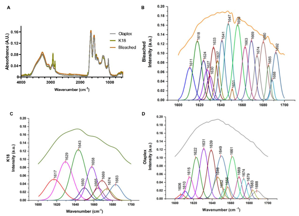 Бондеры типа бис-аминопропил дигликоль дималеата (BADGDM) работают как мягкие тиофильные «мосты»: два винильных конца реагируют с доступными тиольными группами цистеина по механизму Майкла и формируют искусственные сшивки, частично компенсируя разрывы сети S–S, возникшие под действием щёлочи и окислителя [1; 3, с. 4360]. Спектроскопия ИК/КР на кератине выбеленных волос после обработки такими ингридиентами фиксирует сдвиги полос, согласующиеся с ростом доли упорядоченных доменов и уменьшением маркеров окисленной серы; SEM подтверждает более сглаженную чешуйчатую поверхность по сравнению с необработанными беличеными образцами [3, с. 4360]. На иллюстративной выборке коммерческих продуктов FTIR-картирование поперечных срезов демонстрирует пространственные различия в сигнале, соответствующие более «собранному» профилю после BADGDM и отдельных пептидных систем по отношению к чисто выбеленному контролю [1] (рис.). В ряде новых работ описаны альтернативные тиореактивные сшивающие агенты с подтверждённым ростом прочности прядей и восстановлением дисульфидных мостиков по модельным реакциям с цистеином, что расширяет арсенал средств реконструкции при блонд-сервисе [10].