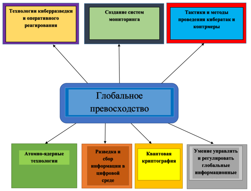 Данные направления широко используются и применяются в информационной войне. Они направлены для достижения стратегических преимуществ, ведения киберразведки, проведения кибератак по критической инфраструктуре противника, а также для защиты собственных информационных систем. Например, направления кибершпионаж и киберразведка, направлены на сбор конфиденциальной информации о планах и уязвимостях систем противника, что будет способствовать быстрому реагированию и принятию мер защиты. Атомно-ядерные технологии и квантовая криптография обеспечивают стратегическое превосходство в области информационной безопасности, затрудняя взлом и перехват конфиденциальных данных. Контроль над глобальными информационными потоками используется для манипуляции общественным мнением, распространения дезинформации и реализации политического влияния. Тактики проведения кибератак и методы защиты выступают главным компонентом в нанесении серьёзного ущерба противнику и в то же время обеспечивая безопасность собственных систем. Все выделенные направления в данной научной статье активно развиваются и применяются в информационной войне для достижения политических, стратегических и оборонных целей. Современная безопасность государства в условиях глобальной информационной войны требует комплексного подхода, объединяющего развитие ядерных, ракетных, космических технологий, криптографии и управления информационными потоками. Данные направления позволяют обеспечить стратегическое превосходство, защиту критической инфраструктуры, а также контроль над информацией и коммуникациями. В результате данные меры направлены на защиту национальных интересов, укрепление суверенитета и предотвращение возможных угроз со стороны противников в цифровую эпоху. В условиях усиления киберугроз и информационной борьбы способность эффективно использовать и защищать эти ресурсы становится ключевым фактором обеспечения безопасности и стабильности государства.