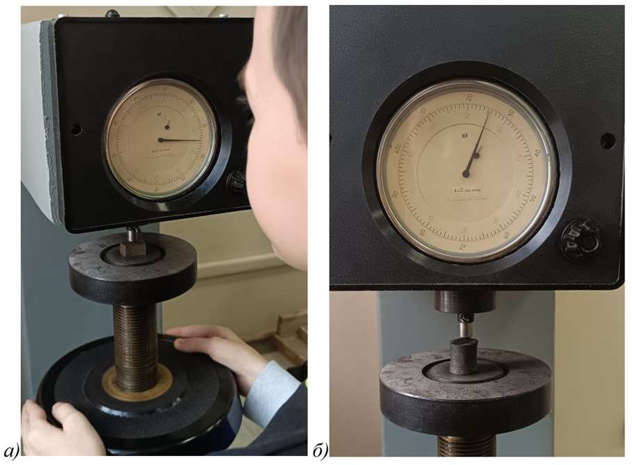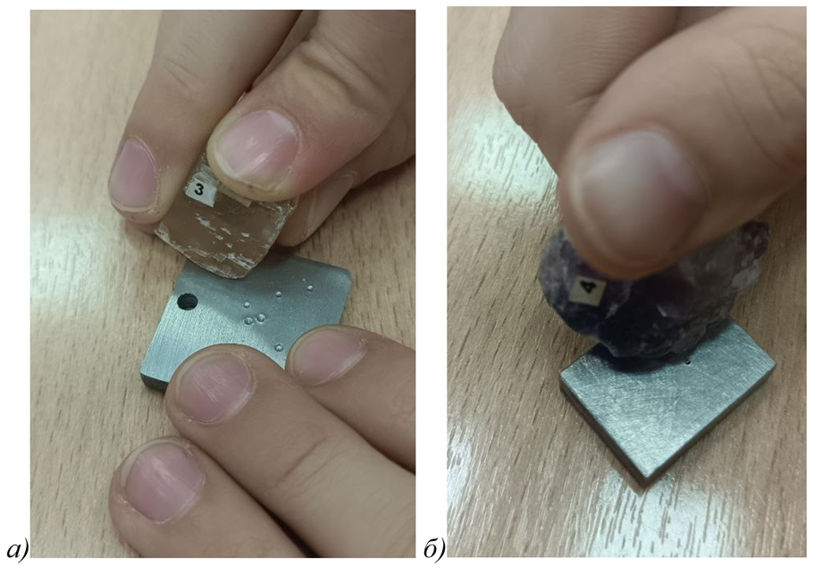 Пятый этап эксперимента. Метод неразрушающей проверки твёрдости материалов- определение твердости по шкале Мооса. Это сравнительный метод оценки устойчивости металлов и минералов к царапинам с помощью 10 эталонных минералов, от мягкого талька (1) до твердого алмаза (10). Чтобы определить твердость исследуемого металла, нужно с нажимом провести по нему представителем шкалы Мооса. Если на минерале останется царапина, то он мягче, если нет – тверже. Алюминий, как самый мягкий из рассматриваемых металлов имеет твердость примерно 2-3 (что сравнимо с кальцитом) (рис. 5, а). Твердость титана на уровне 6 единиц, что соответствует твердости ортоклаза. Титан по характеристикам твердости явно превосходит отожженную сталь, которую царапает эталонный образец флюорит с твердостью 4 (рис. 5, б), но уступает закаленным образцам стали (с твердостью кварца 7). Данные твердости по шкале Мооса еще раз подтвердили значения твердости, полученные при испытании на Роквелле.