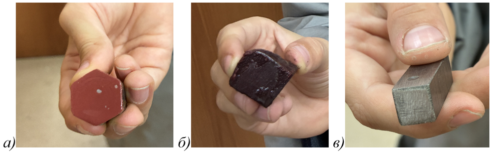 Рис. 3. Фотографии стальных (а), алюминиевых образцов(б) с осаждением меди на поверхности и титановых (в) без следов воздействия