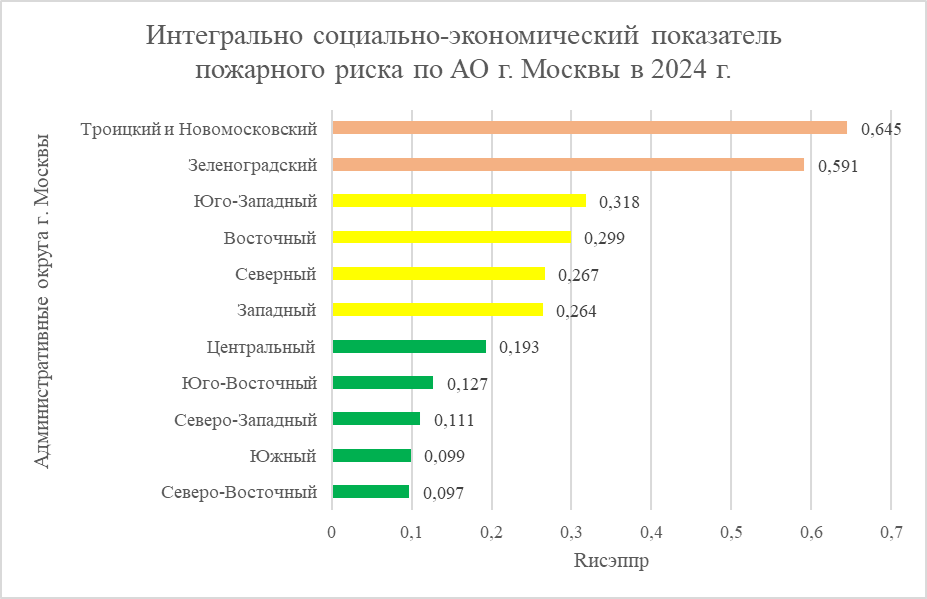 Полученные данные по административным округам г. Москвы представлены в виде гистограммы на рисунке 2 и упорядочены по убыванию значений интегрального социально-экономического показателя пожарного риска.