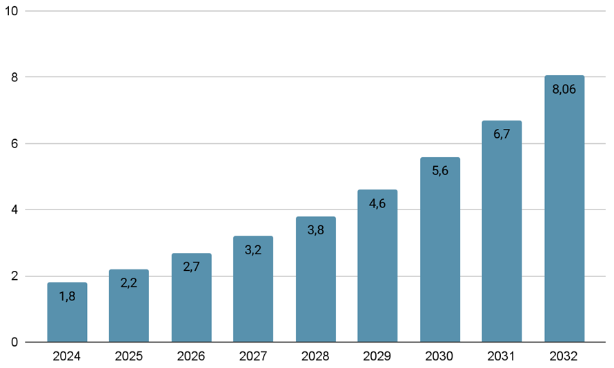Рис. Прогноз роста рынка облачных микросервисов, 2024–2032 гг. в млрд долларов (составлено автором на основе [6])