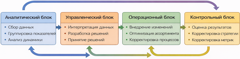 Описание: схема отражает взаимосвязь аналитического блока (сбор и группировка показателей), управленческого блока (принятие решений), операционного блока (реализация изменений) и контрольного блока (оценка результатов и корректировка).