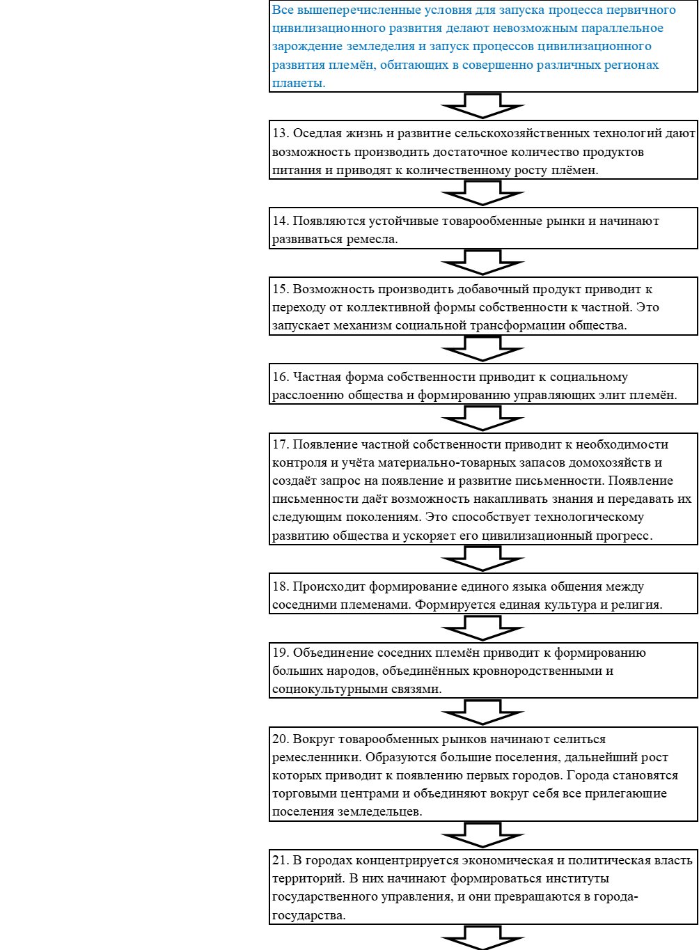 Процесс первичного развития цивилизации для своего запуска требует совпадение ряда уникальных условий, изложенных во втором разделе данной статьи и в таблице на рисунке 2.