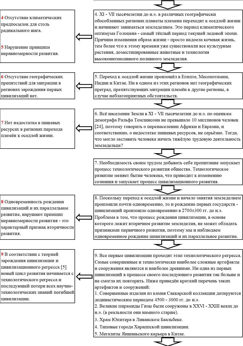 Как уже было замечено ранее, в разделе 4.3, процессы становления земледелия и формирования всех современных цивилизаций имеют признаки вторичного развития.