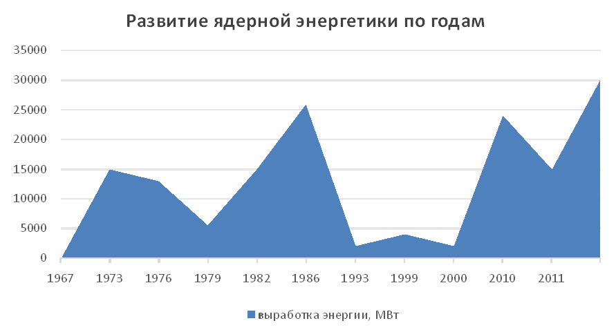 Рис. Мировое развитие ядерной энергетики по годам