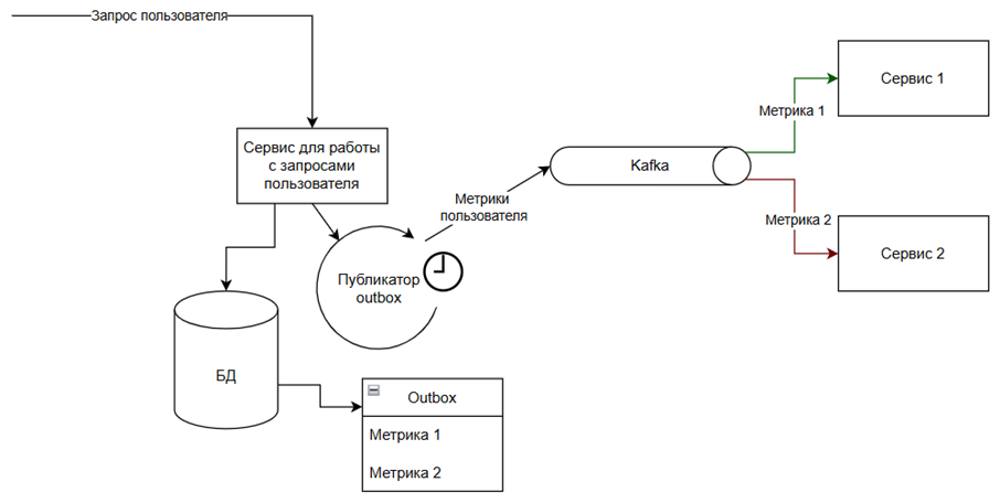 Рис. 2. Обмен метриками пользователя через Kafka с Transactional outbox