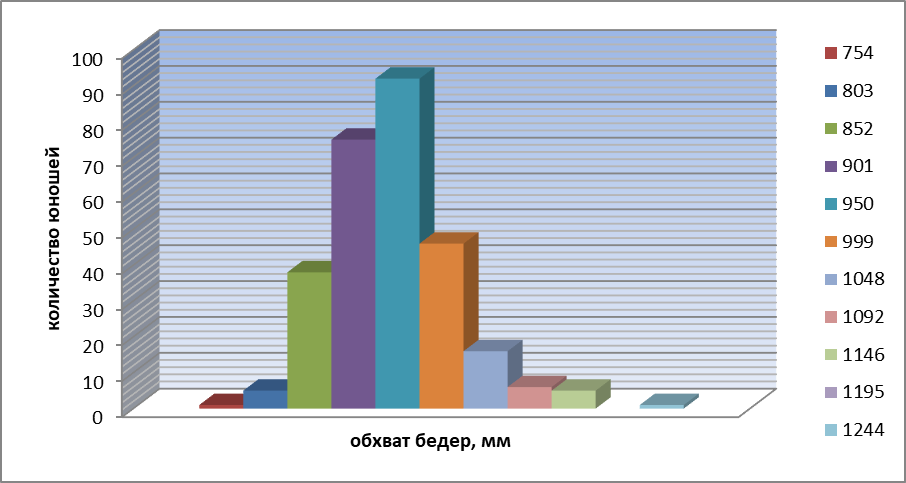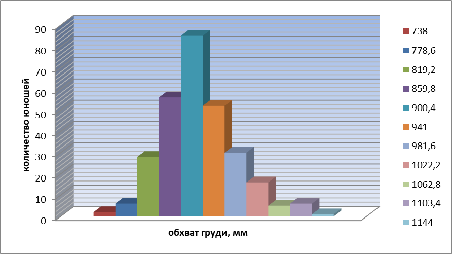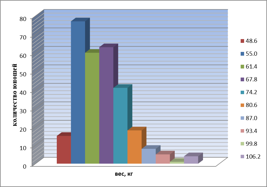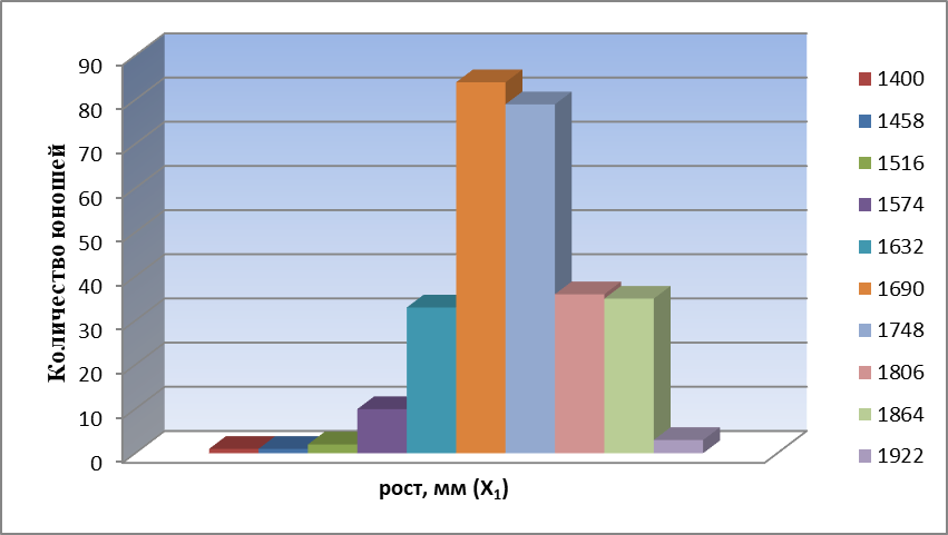Для исследования была составлена таблица шести антропологических параметров 284 юношей в возрасте 18–20 лет: рост (X1), вес (X2), плечевые размеры (X3), обхват груди (X4), обхват талии (X5), обхват бедер (X6), гистограммы которых представлены на рисунках 1–6. Для удобства дальнейшей работы исходная таблица данных была разбита на однородные группы по методике многомерных группировок [3], а также по подходу, изложенному в предыдущих работах [5, с. 104-118; 6, с. 87-89], результаты которой представлены в таблицах 1 и 2. Как видим, число строк исходной таблицы данных сократилось с 284 до 30 строк, что существенно уменьшает трудоемкость дальнейших вычислений.