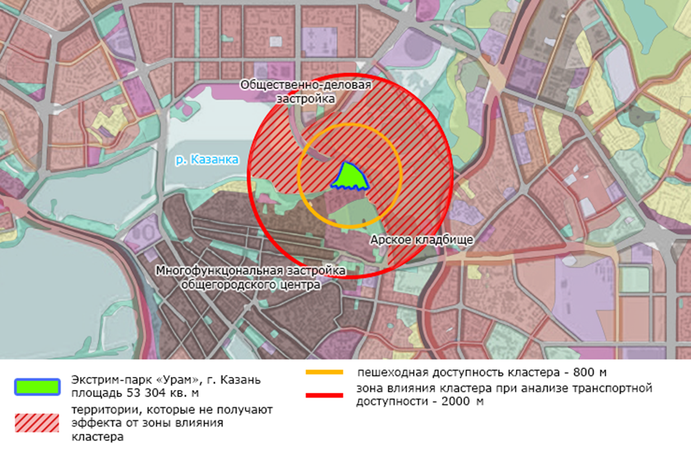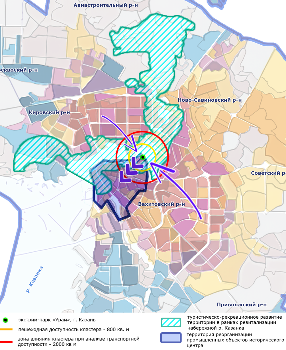 Рис. 1. Схема расположения комплекса экстрим-парка «Урам» в структуре городской ткани города Казань (анализ доступности, зоны влияния)