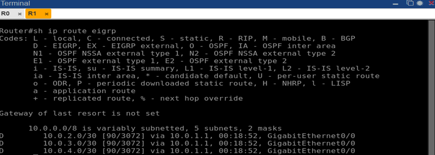 Рис. 8. Таблица маршрутов EIGRP на маршрутизаторе R1 (вывод команды show ip route eigrp)